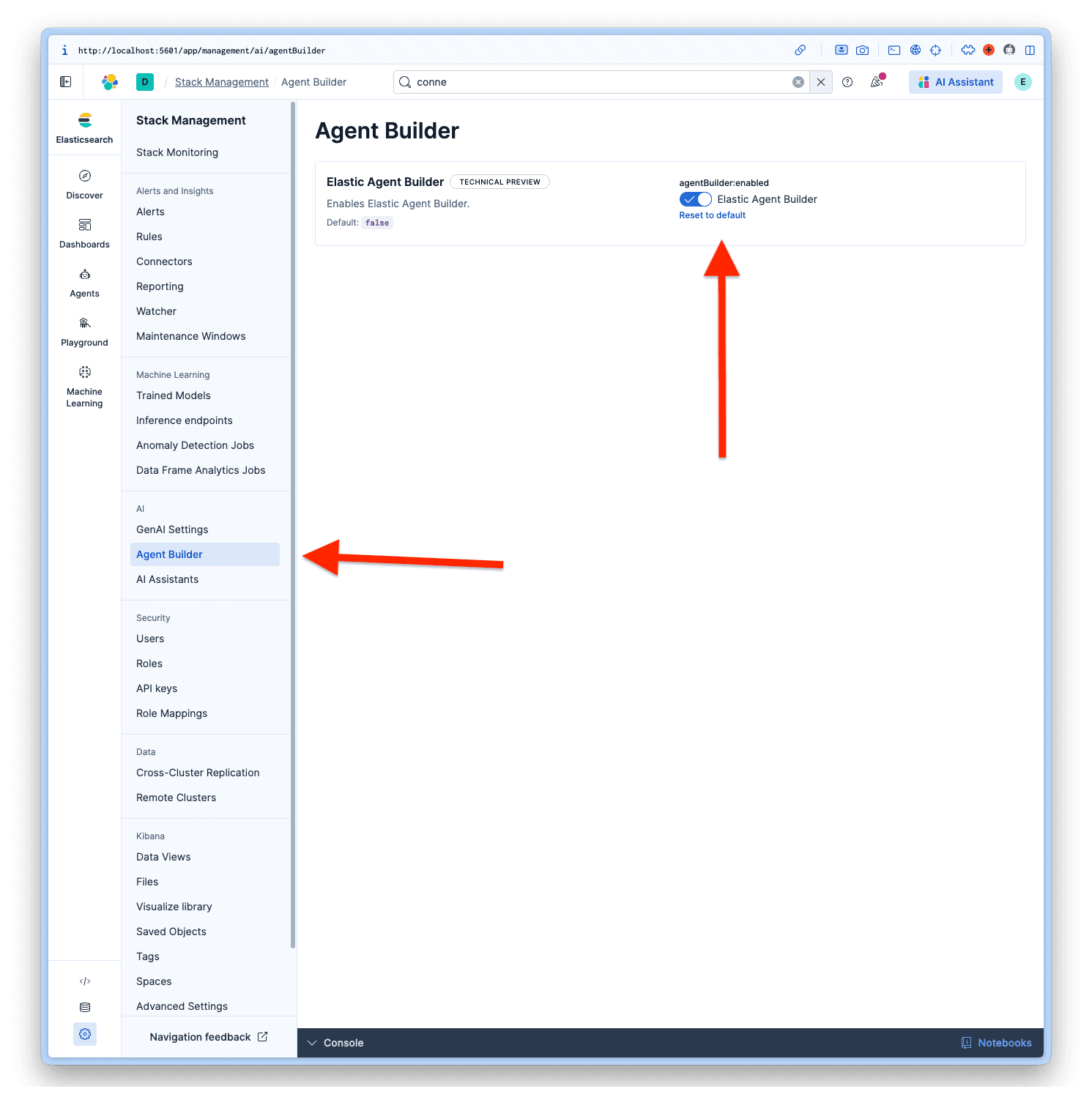 Once logged in to Kibana, navigate to Management > AI > Agent Builder and activate the Agent Builder.