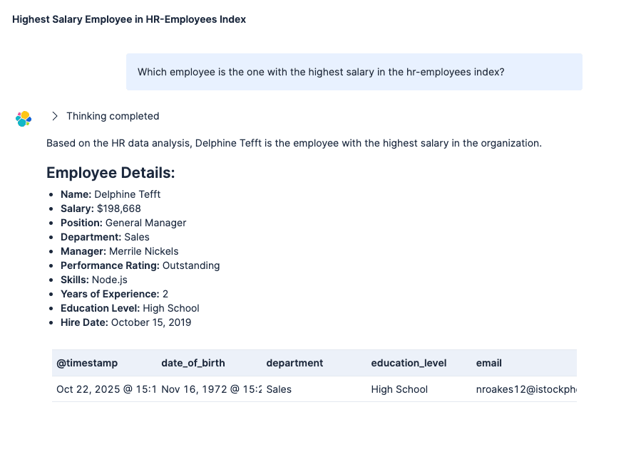 This article will show you how to build an AI agent for HR using GPT-OSS and Elastic Agent Builder. The agent can answer your questions without sending data to OpenAI, Anthropic, or any external service.