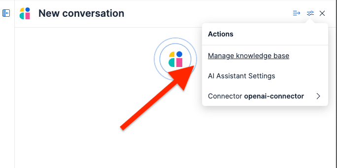 Once our connector is ready, we need to upload our company’s knowledge base to ensure accurate and context-specific answers. To get there, click Actions > Manage knowledge base. This is located under the assistant conversation window.