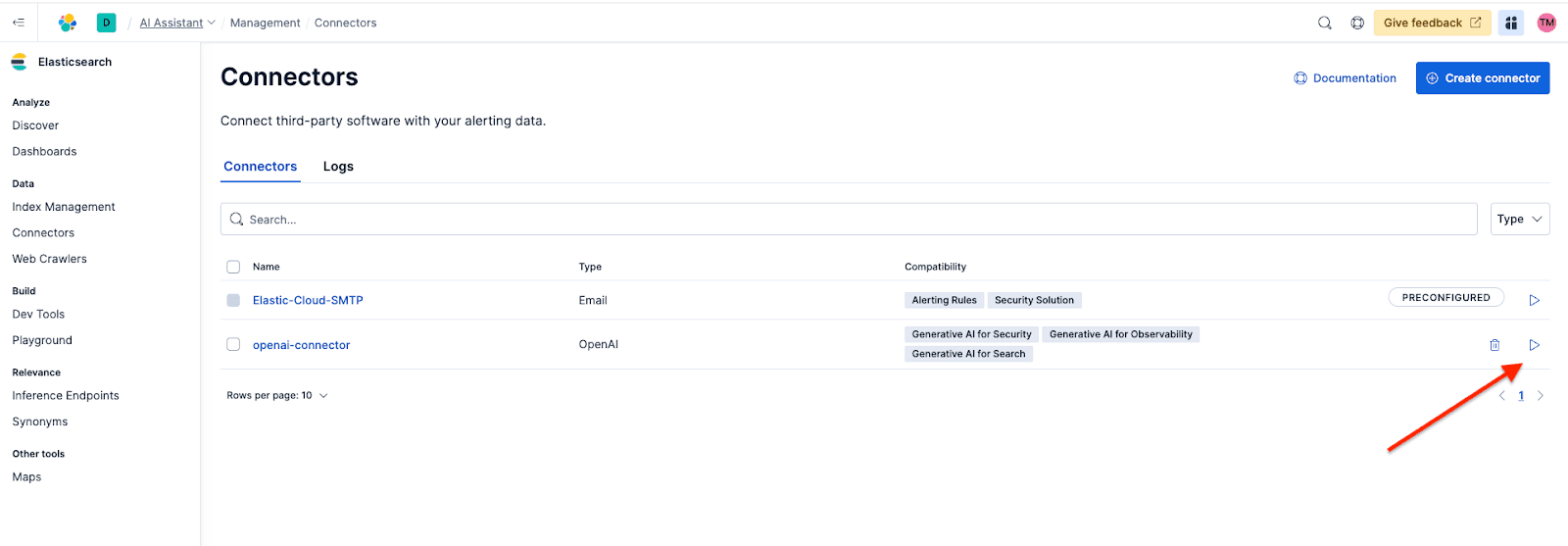 To test your connector, you can go to Management > Connectors and click the play button on the connector we just created.