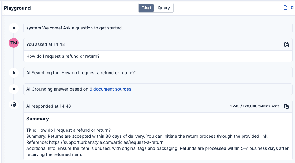 Now that the index is ready, we can start working with Playground and ask questions about the information in our knowledge base. The answers will follow the format we specify in the system prompt.