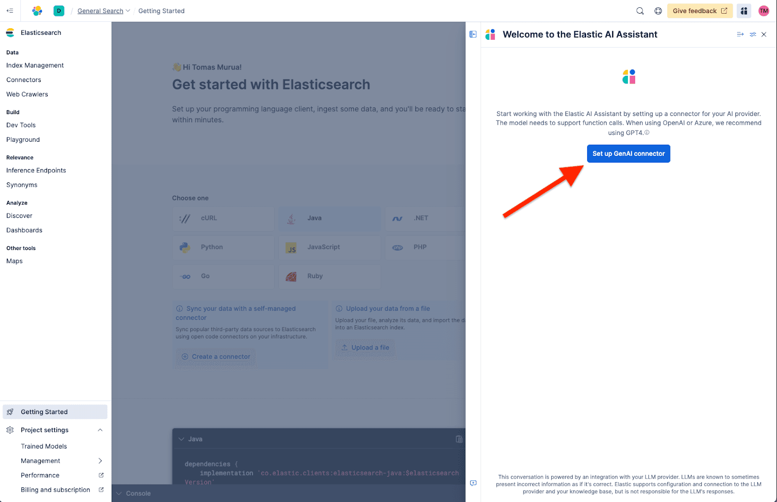 This will open the AI Assistant UI, where we need to configure a GenAI connector to allow our application to connect to a supported LLM provider.
