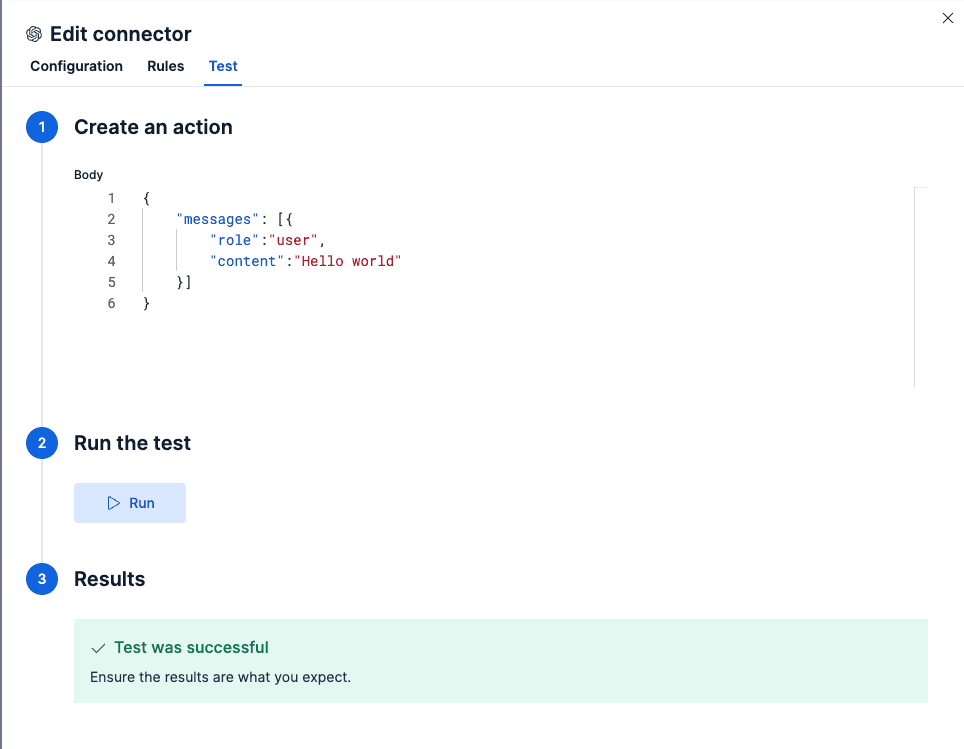 Here, we fill in the connector’s information. Keep in mind that you must have an Open AI API key available.