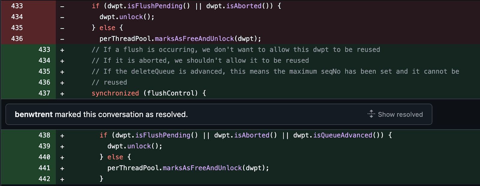 My initial investigation pointed me to a couple of critical sections that were not appropriately synchronized. All interactions to a given DocumentsWriterDeleteQueue are controlled by its enclosing DocumentsWriter. So while individual methods may not be appropriately synchronized in the DocumentsWriterDeleteQueue, their access to the world is (or should be). (Let’s not delve into how this muddles ownership and access—it’s a long-lived project written by many contributors. Cut it some slack.)