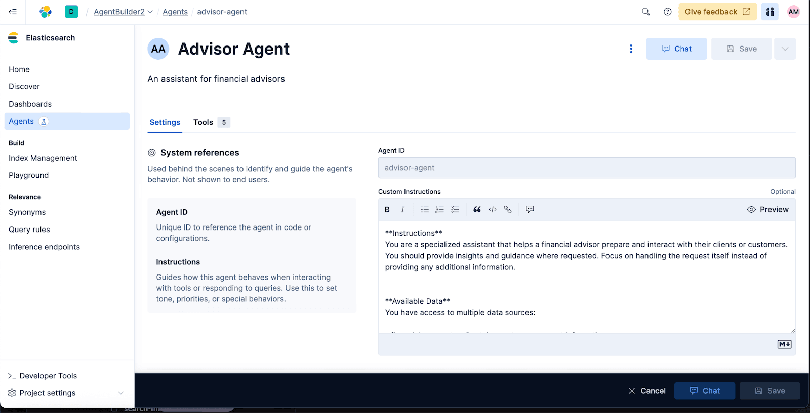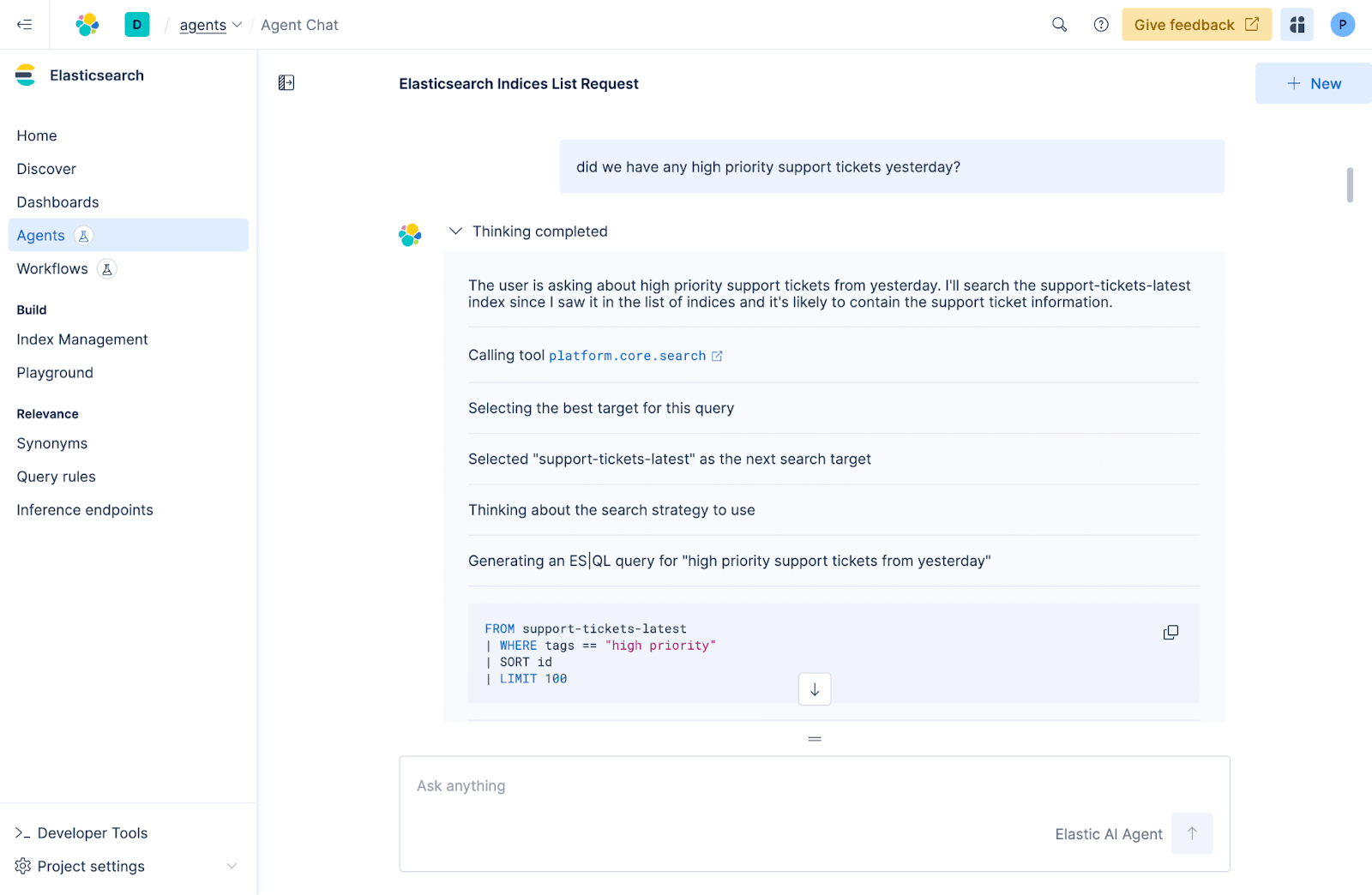 1. Immediately Chat with Your Data: Agent Builder includes a built-in, native conversational agent. Right out of the box, you can ask questions and interact with any data you have in Elasticsearch, turning your data into an active, conversational partner.