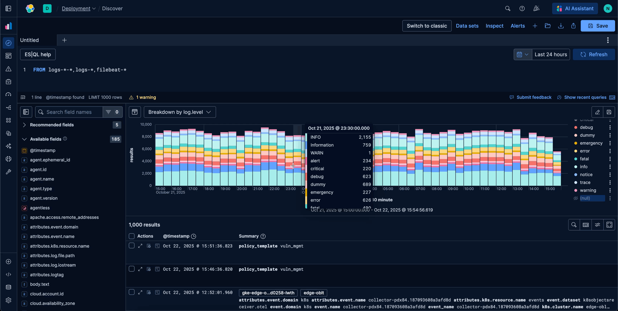 The single biggest shift in Discover is the integration and General Availability of ES|QL, which became generally available in version 8.14 (on both Elastic Cloud and self-managed). This moves Discover beyond filtering and exploration into the realm of, efficient real-time data transformation and analysis. With ES|QL, you can now transform, aggregate, and join data directly from the query bar.