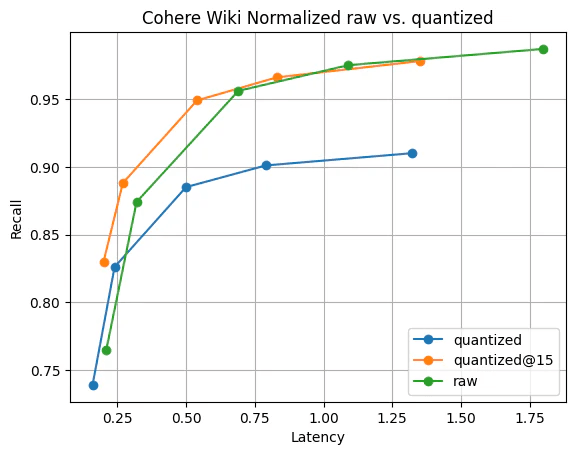 Recall@10 for quantized vectors vs raw vectors. The search performance of quantized vectors is significantly faster than raw, and recall is quickly recoverable by gathering just 5 more vectors; visible by quantized@15.