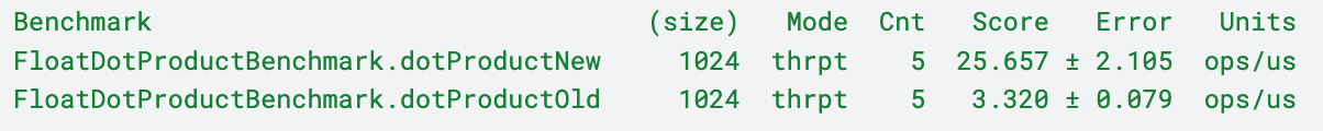 Micro-benchmark comparing dot product with the new Panama API (dotProductNew) and the scalar implementation (dotProductOld).