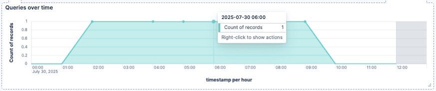 Total queries: A simple document count of the index to show how many queries have been received in total. This shows the big picture and answers the question of how many total queries we had in the selected time window.