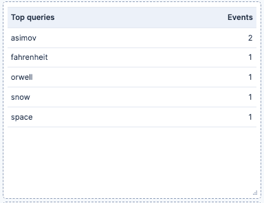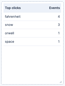 Top clicks: A table with a count of the number of events split by the query they come from. It uses a Top values function on the user_query.keyword. This can give us visibility on which queries generate more interactions on our webpage.