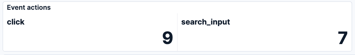 Event actions: Counts actions by action_name. This is a simple count of documents split by action_name.keyword. In our sample data, we have two types of actions: