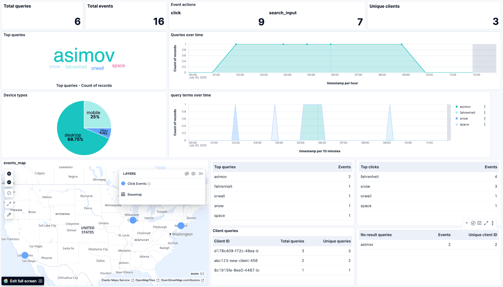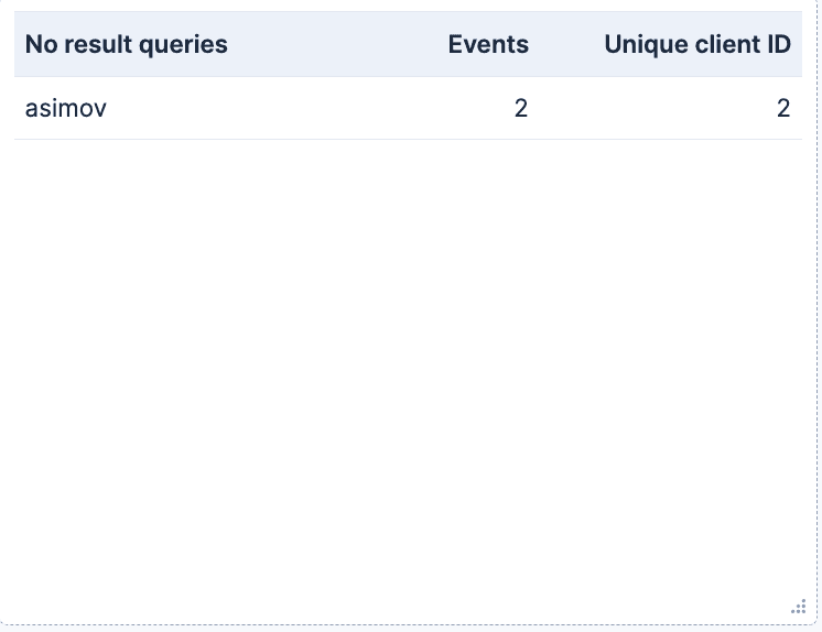 No result queries: A Top value table that shows the top query_terms that didn’t match any document, and a Unique Count of the field client_id. This can be very useful to determine what products our website is lacking. For example, in an e-commerce book store, seeing regular searches for a particular book title could lead us to buy copies to sell. Alternatively, it can also indicate shortcomings in our search implementation, for example, if people are using question-based searches that align better with semantic search approaches.