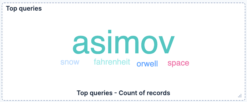 Top queries (tag cloud): A Tag cloud of the top 5 most searched terms. This visualization uses the field user_query.keyword and allows us to easily see the main terms that our users are looking for.