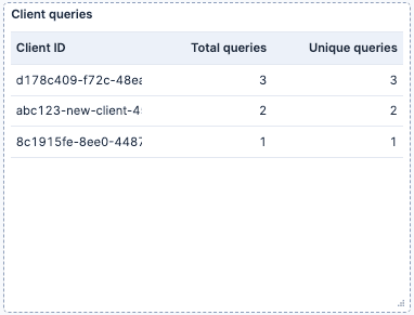 Client queries: A Top values table of the client_id field that counts the total queries and unique queries per client.
