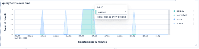 Query terms over time: Similar to the last one, but broken down by the user_query.keyword. This chart can show how many different terms are searched over time.