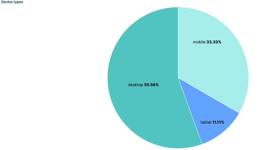 Device types: This visualization breaks down the percentage of events by the device they come from. The device can be one of three categories: Desktop, mobile, or tablet. This visualization is a pie that uses the top values of event_attributes.object.device.keyword, and can give us insights into which type of devices our users have. This can generate alerts if we detect an unexpected, sudden fall of events on a specific type of device, as this might indicate that a recent change in our app resulted in errors when accessing it from a device.