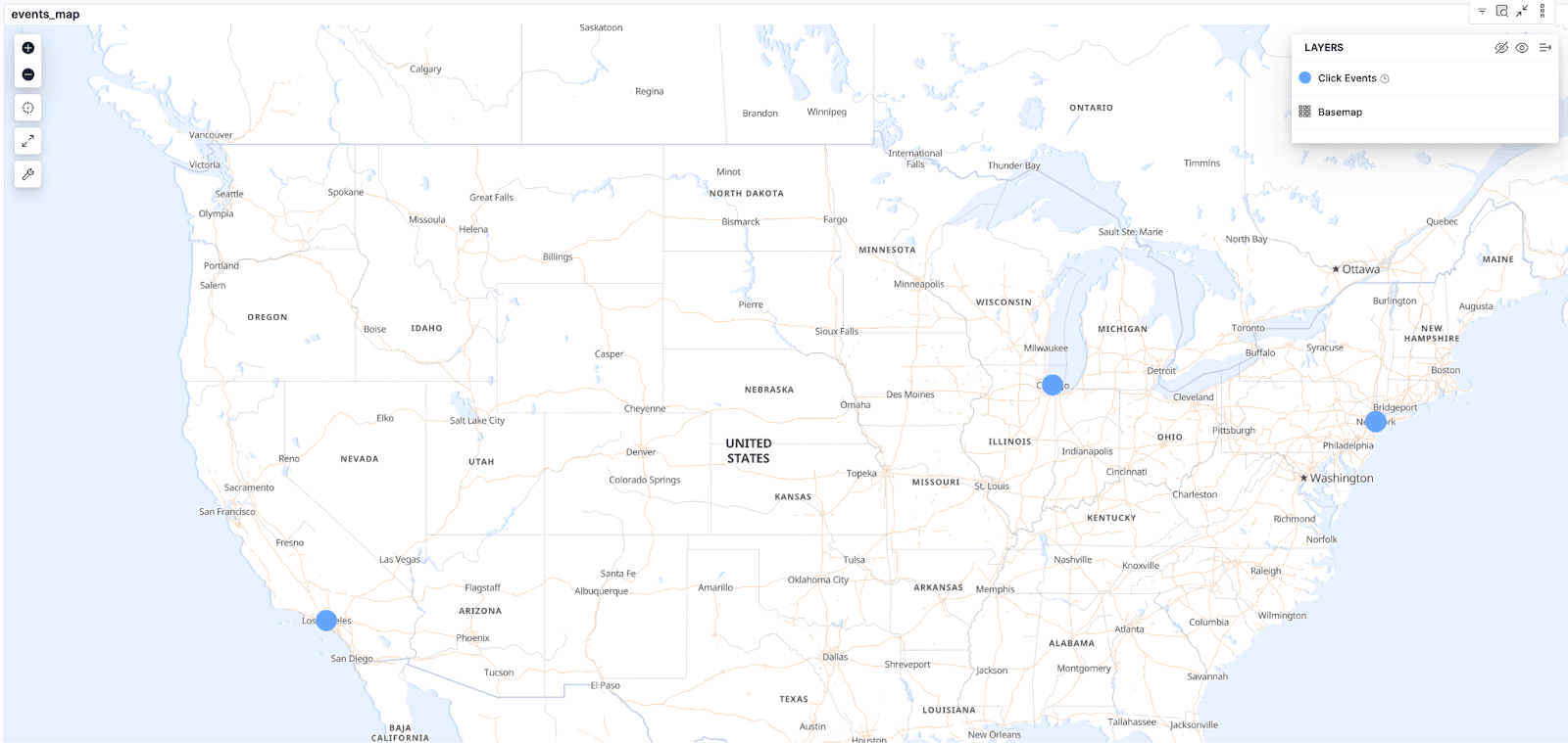 Events map: A map visualization that shows where the events are coming from, which allows us to see the geographical distribution of our users. Right now, this shows where individual documents come from, but this can also be used to see the density of users with a heatmap, for example.