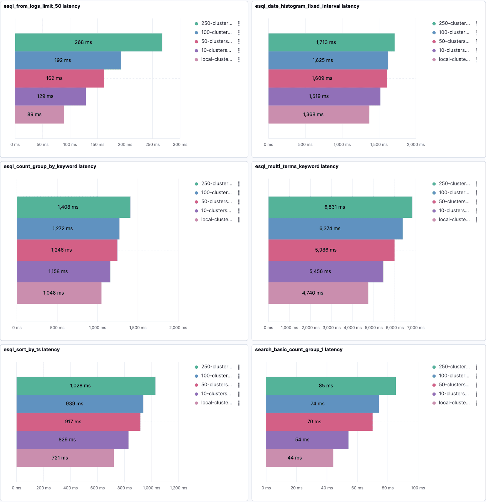 Below is a sample of benchmark results for various queries depending on the number of remote clusters connected to the local cluster, from local-only to 250 connected clusters. You can see that while the computation becomes somewhat slower when working with more clusters, due to the inevitable costs of network traffic, the increase is much less than linear to the number of clusters.