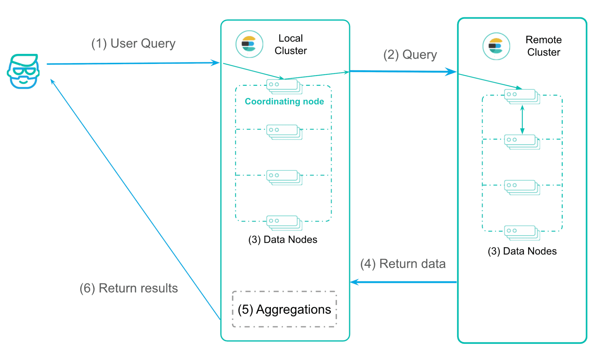 - The user sends the query to the local Elasticsearch cluster. This query is routed to one of the cluster nodes, further referred to as the coordinator node. This node is responsible for executing the query, aggregating the results, and sending them to the user. The coordinator node parses the query, validates it, and generates a query plan that describes the exact manner of query execution. The coordinator then figures out which other local nodes and remote clusters need to be contacted to execute the query.