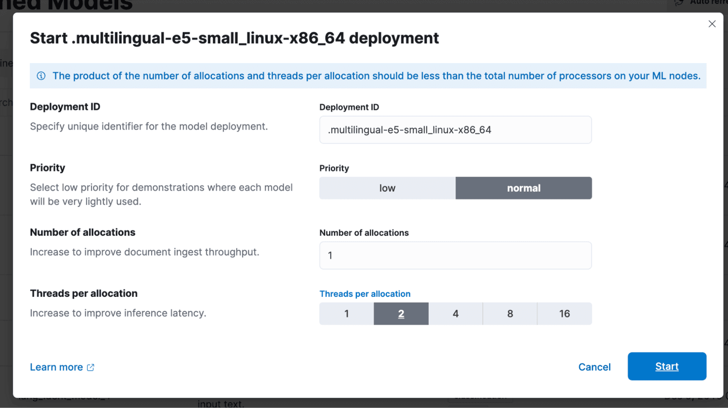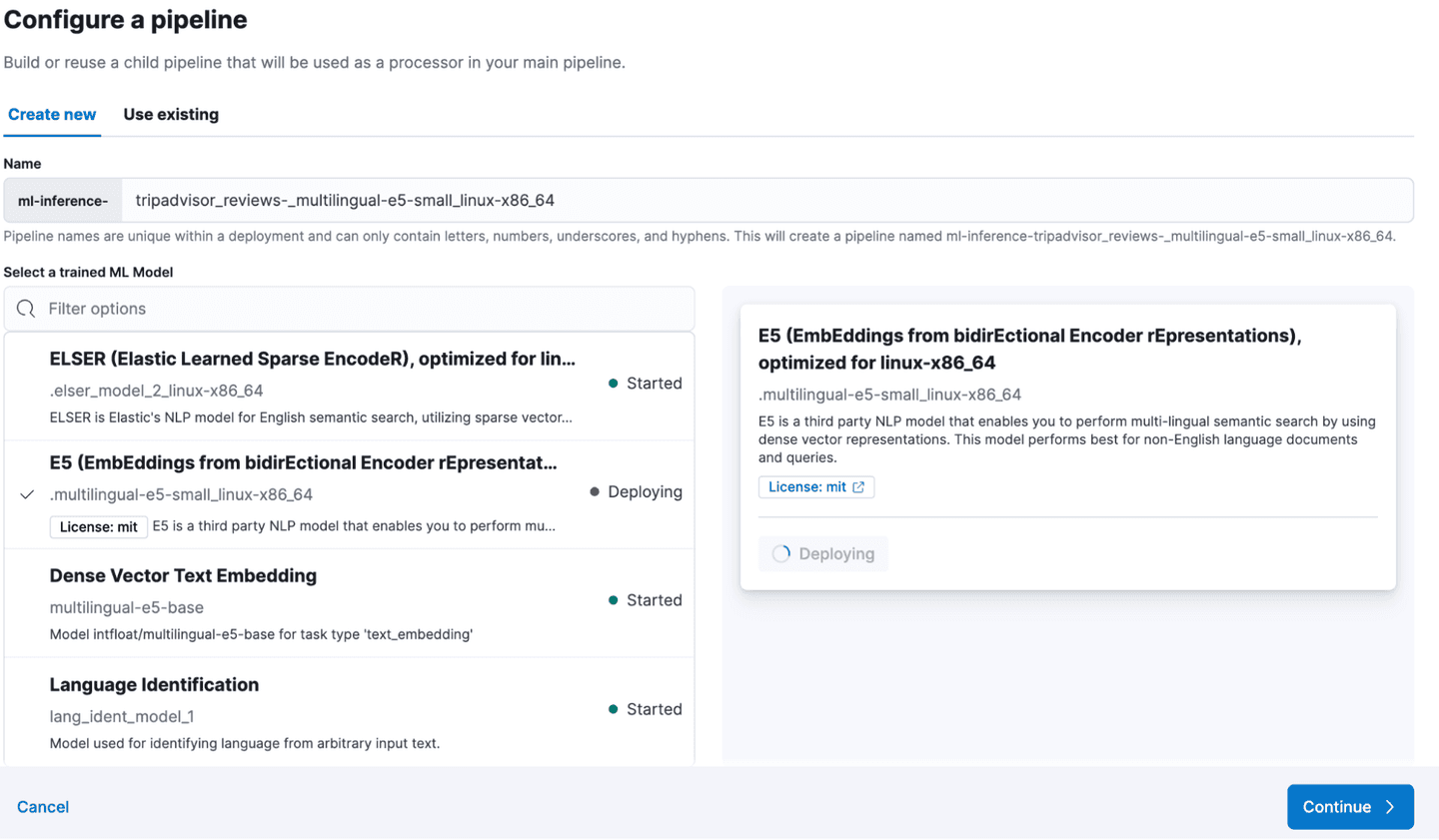 1. To integrate the e5 model with the ingest pipeline, navigate to 'Pipelines' in the newly created index, deploy and start the Machine Learning (ML) inference pipeline. The text fields for inference in this case are 'text', 'tagsPOI' and 'namePOI'.