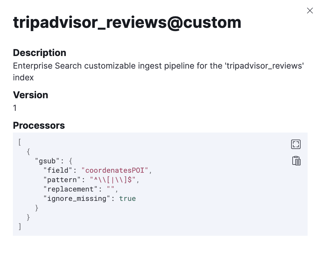 1. In this dataset, we need to tweak the "CoordinatesPOI" field so it fits the geopoint mapping formats. To make this happen, we use a custom ingest pipeline with a gsub processor. It changes the coordinates field from a string array format like "[1,2]" to a string format like "1,2".