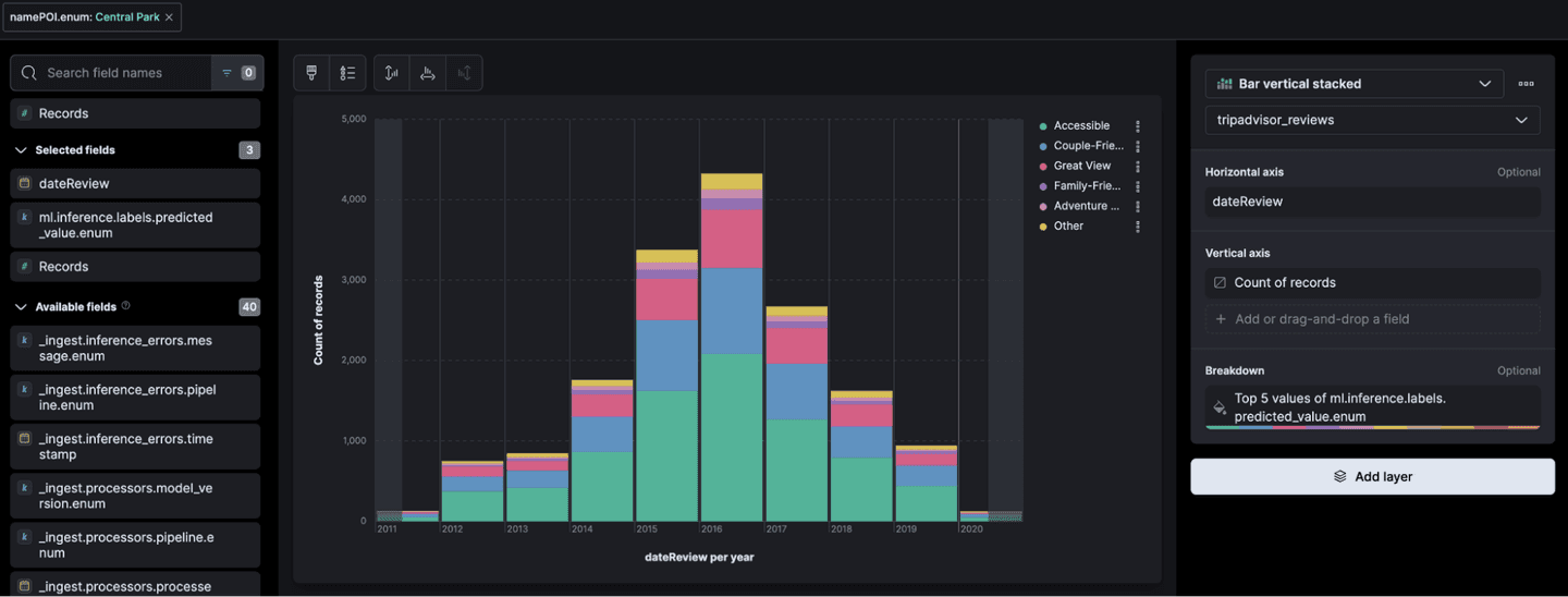 As Elastic is bundled with Kibana and can be leveraged for aggregations combined with semantic search, it is possible to analyze the data in multiple ways and generate reports via Kibana Lens. In the review data scenario, this information can be shared with businesses that are looking to understand trend analysis on the perception of their business.
