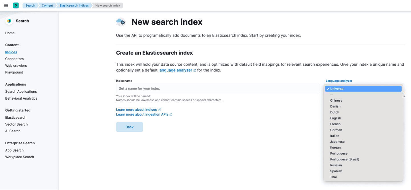 This index gets key parts ready for full-text search, such as tokenization and analysers. With the reviews being multilingual, the Universal analyser is a great choice to handle different languages. However, if needed, you can choose a specific language analyser.