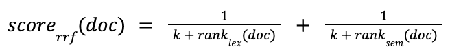 RRF, however, doesn’t require any score calibration or normalization and simply scores the documents according to their rank in the result set, using the following formula, where k is an arbitrary constant meant to adjust the importance of lowly ranked documents: