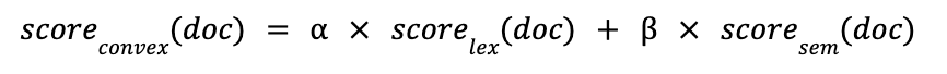Basically, Convex Combination, also called Linear Combination, seeks to combine the normalized score of lexical search results and semantic search results with respective weights and (where ), such that:
