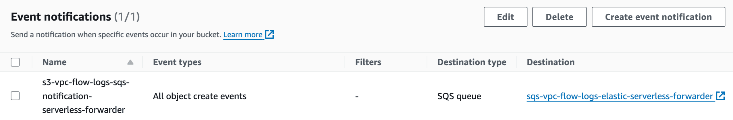AWS Console > S3. Select bucket s3-vpc-flow-logs-elastic -> Properties and Create event notification