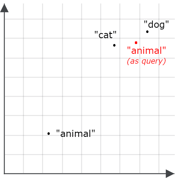 This makes it less likely that a query for “animal” will retrieve documents about cats and dogs — the opposite of our goal. So instead, we encode “animal” differently when it’s a query than when it’s a target for retrieval: