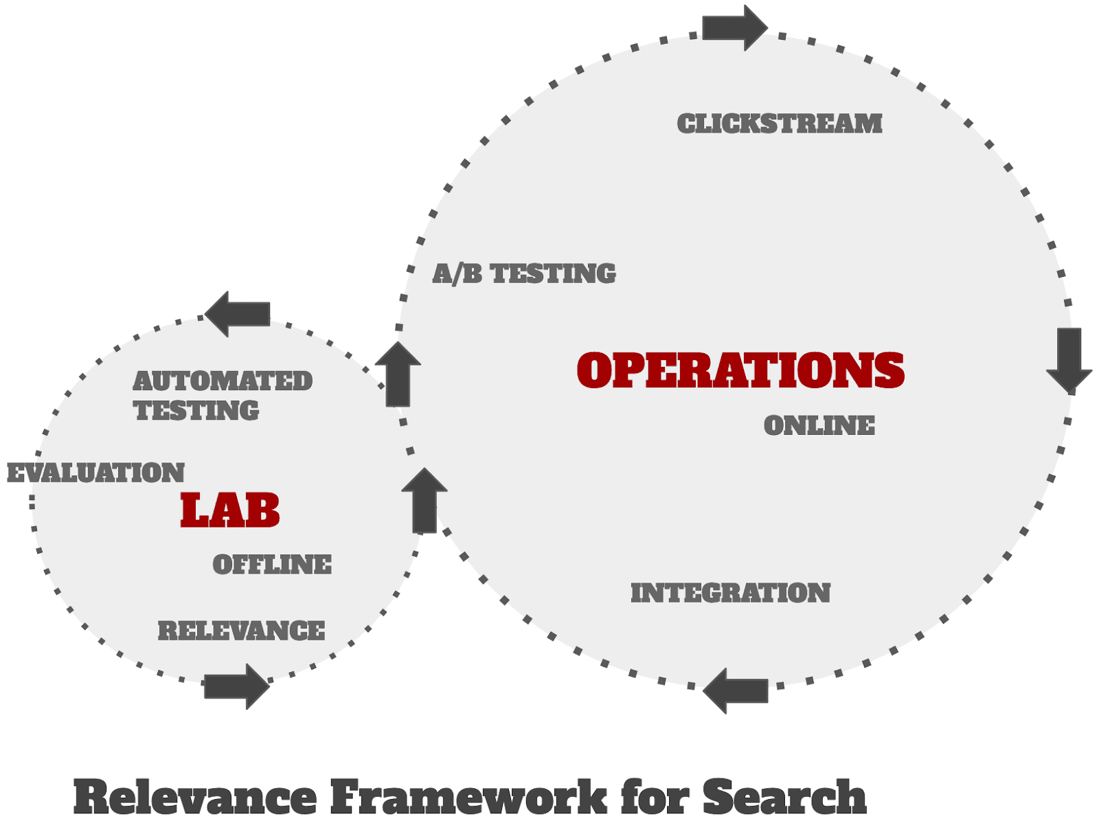 Search quality improvement is an iterative process that involves evaluating and refining search algorithms to better meet user needs. Judgment lists play a central role in offline experimentation (the smaller, left cycle in the image below), where search results are tested against predefined relevance scores without involving live users. This allows teams to benchmark performance, identify weaknesses, and make adjustments before deploying changes. This makes offline experimentation a fast and low-risk way of exploring potential improvements before trialing them in an online experiment.