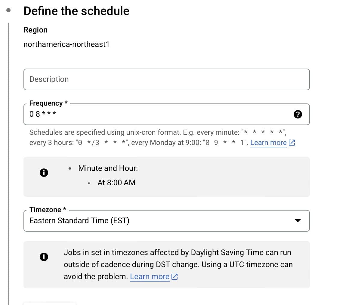 In Cloud Scheduler, you can set up your function to run at a regular interval using unix cron format. I have the code set to run every morning at 8 am in my timezone.