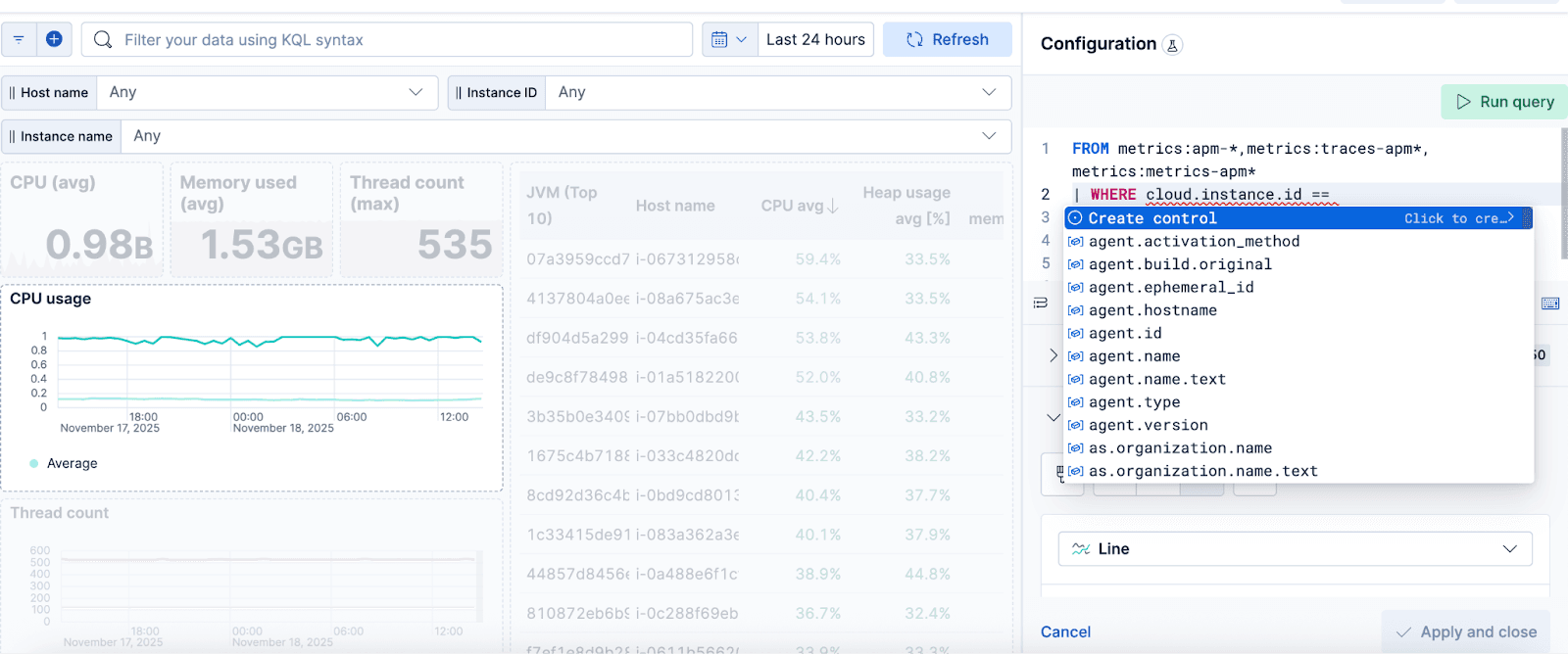 The easiest (and probably most delightful) way to create a variable control is directly from the ES|QL query editor in your visualization. Just start typing your query, use the autocomplete menu, and Kibana will helpfully scaffold the control for you.
