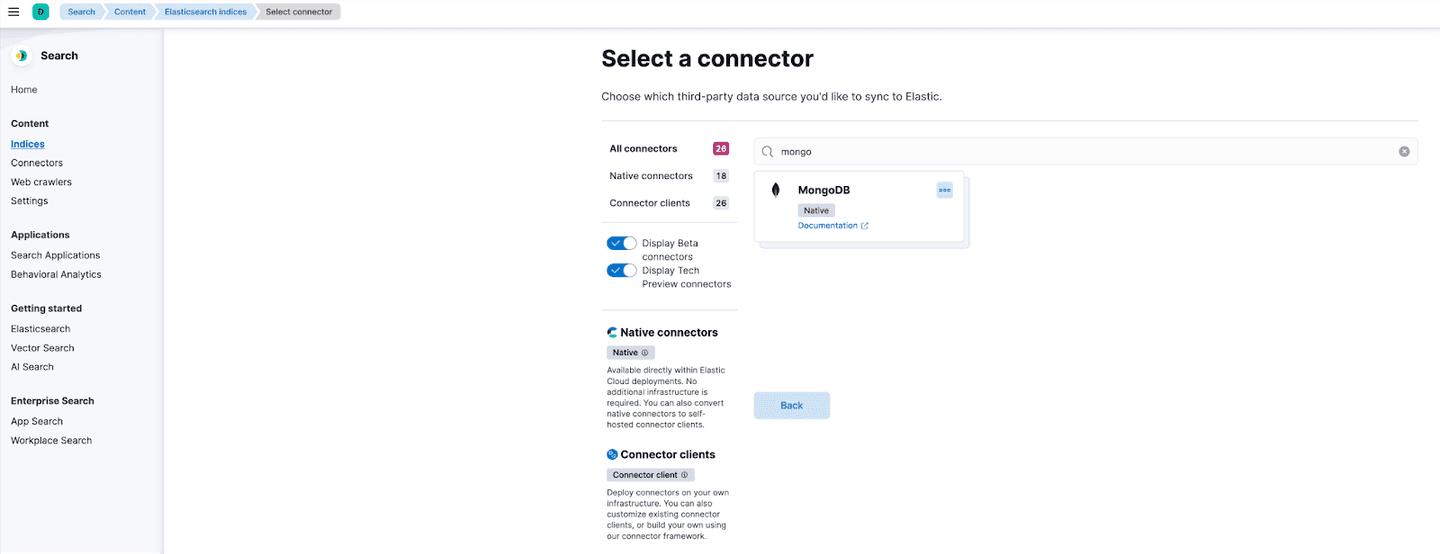 The Elastic MongoDB connector provides a simple way to sync MongoDB data into Elasticsearch deployments. It is relatively easy to implement connectors and take advantage of industry leading search experience with Elastic. Learn more about connectors in our documentation.