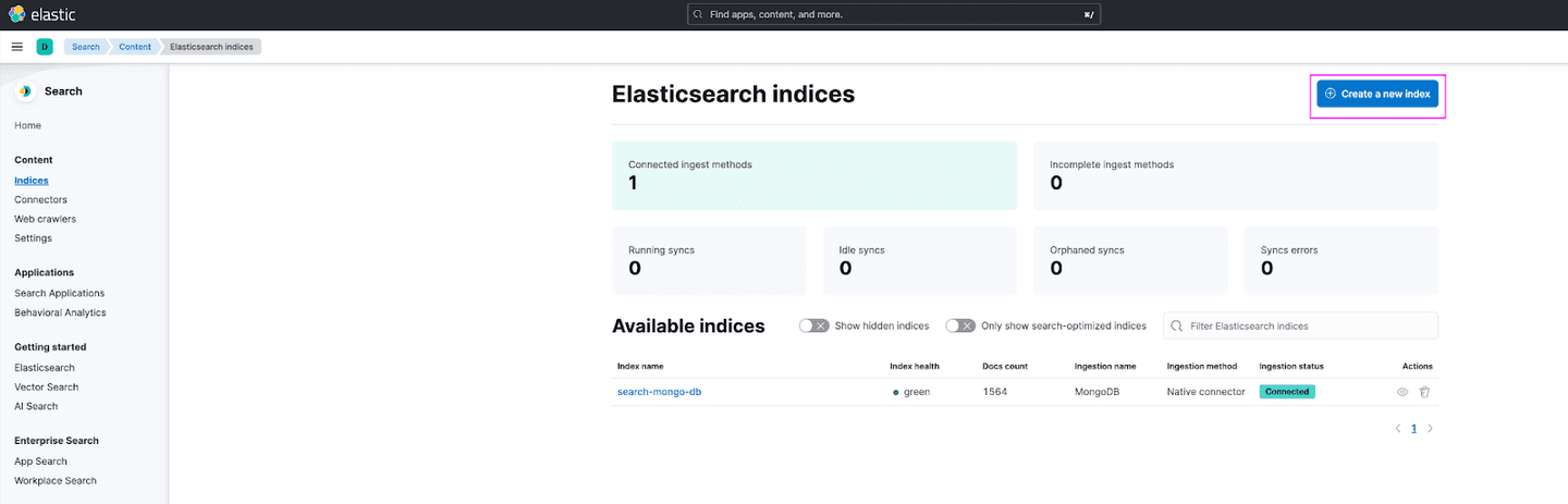 - Login to Kibana and go to Search -> Content -> Indices -> Create a new index.