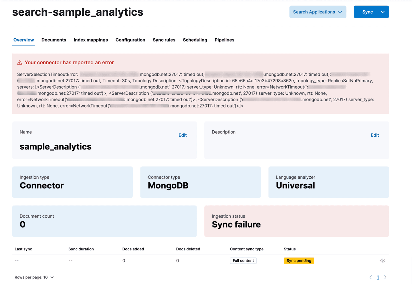 Use sync rules and ingest pipelines to customize syncing behavior for specific indices. Each sync is a full sync and for each document the connector transforms every MongoDB field into an Elasticsearch field.