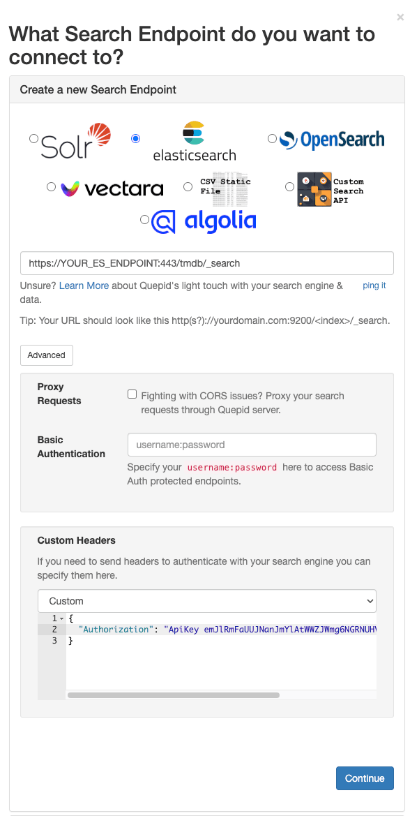 Enter your Elasticsearch endpoint information (https://YOUR_ES_HOST:PORT/tmdb/_search) and any additional information necessary to connect (the API key in case of an Elastic Cloud deployment in the Advanced configuration options), test the connection by clicking on ping it and select Continue to move to the next step.