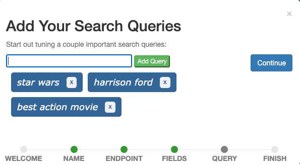 The last step is adding search queries to the case. Add the three queries star wars, harrison ford, and best action movie one by one via the input field and Continue.