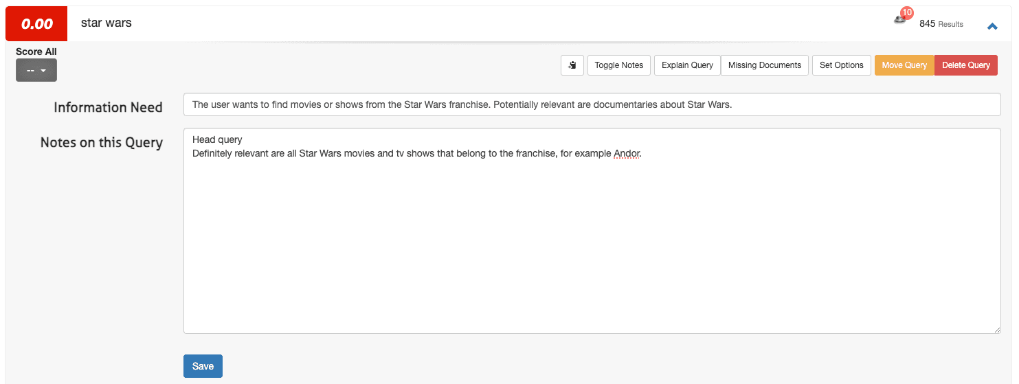 Ideally, a case contains queries that represent real user queries and illustrate different types of queries. For now, we can imagine star wars being a query representing all queries for movie titles, harrison ford a query representing all queries for cast members, and best action movie a query representing all queries that search for movies in a specific genre. This is typically called a query set.