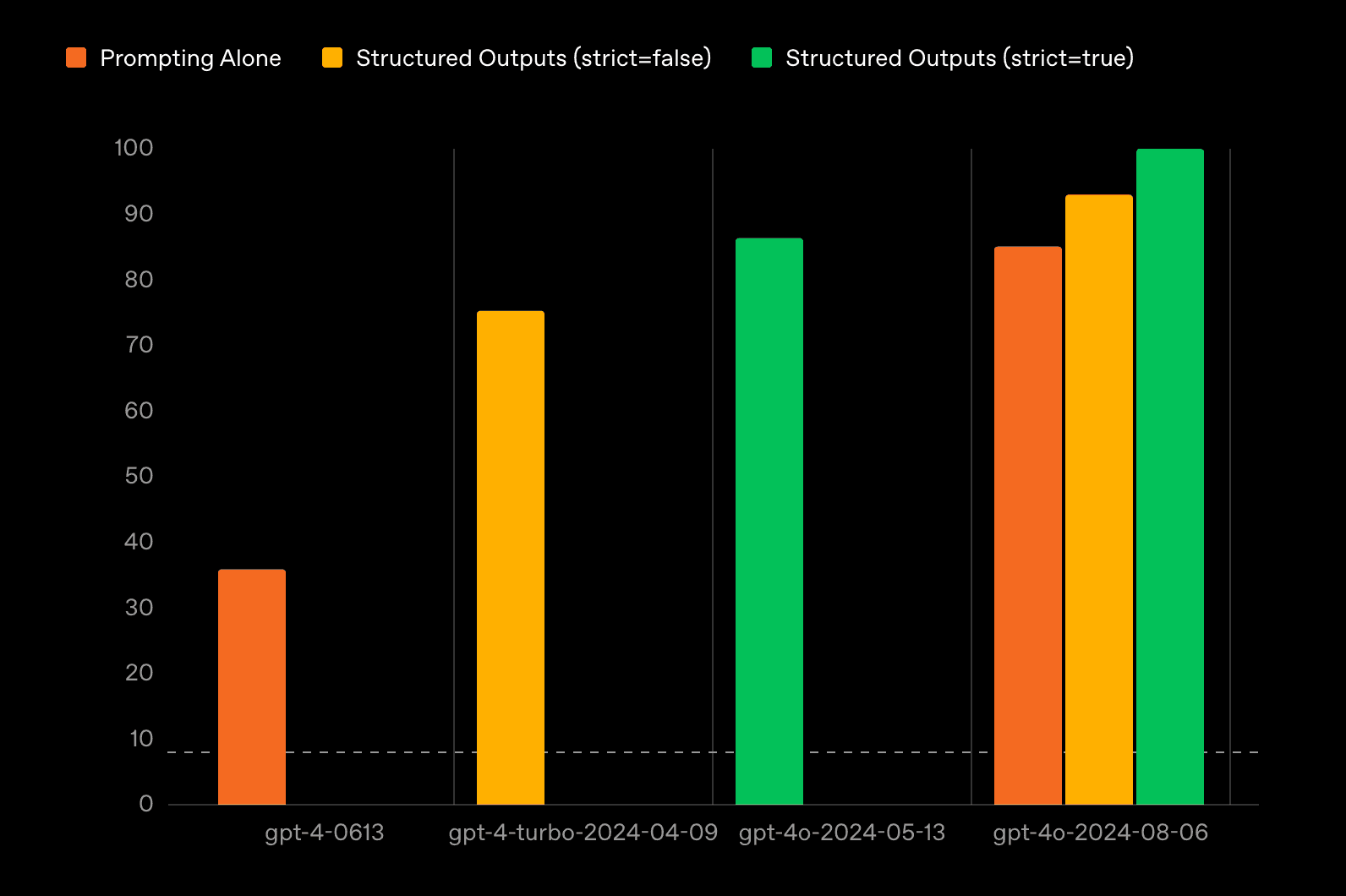 In this visual, their model gpt-40-2024-08-06 with structured outputs has a perfect score, while their previous model gpt-4-0613 without structured outputs scores below 40%.
