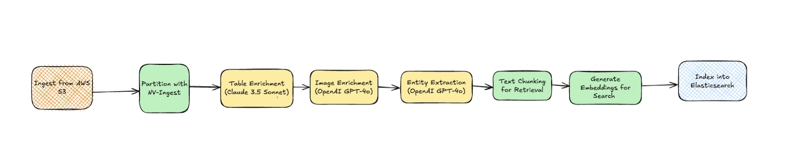In this blog, we will discuss how to implement a scalable data processing pipeline using NVIDIA NeMo Retriever extraction models, Unstructured Platform and Elasticsearch. This pipeline transforms unstructured data from a data source into structured, searchable content ready for downstream AI applications, such as RAG. Retrieval Augmented Generation (RAG) is an AI technique where Large Language Models (LLMs) are provided with external knowledge to generate responses to user queries. This allows LLM responses to be tailored to specific context, making answers more accurate and relevant.