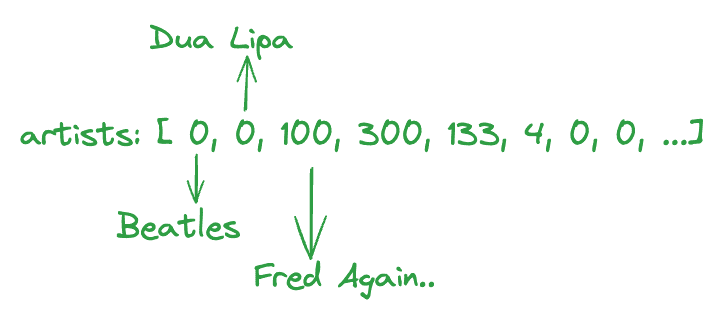 We tried squeezing our vector where each position represented an artist into a dense_vector field, however it's not the best fit as you can tell. We are limited to 4096 artists and we end up with a large array that has a lot of null values. Philipp might never listen to Pink Floyd yet in the dense vector approach, Pink Floyd will take up one position with a 0. Essentially, we were using a dense vector format for data that is inherently sparse. Fortunately, Elasticsearch supports sparse vector representation through the sparse_vector type. Let’s explore how it works!