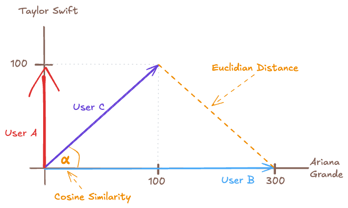 • The Euclidian distance measures the direct distance between two points, with shorter distances indicating higher similarity. This method is sensitive to both direction and magnitude. In our case, user C is closer to user A than to user B because the difference in their positions results in a shorter distance.