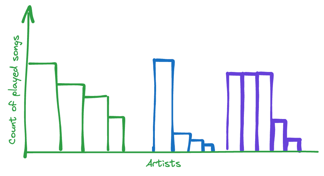 The idea is to simply create a huge array where we do a key => value sorting approach. The key is the artist and the value is the count of listened to songs. This is a very simple approach and can be done with a few lines of code. We create this vector:
