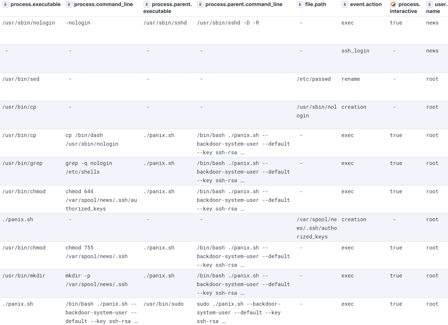 We can hunt for this technique using ES|QL and OSQuery by focusing on identifying unauthorized SSH key additions, tampered system files, and unusual activity involving system users such as news or nobody. The following key areas are effective for detection: