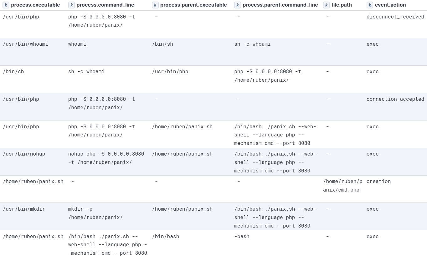 - Creation or renaming of web shell files: Tracks files with extensions such as